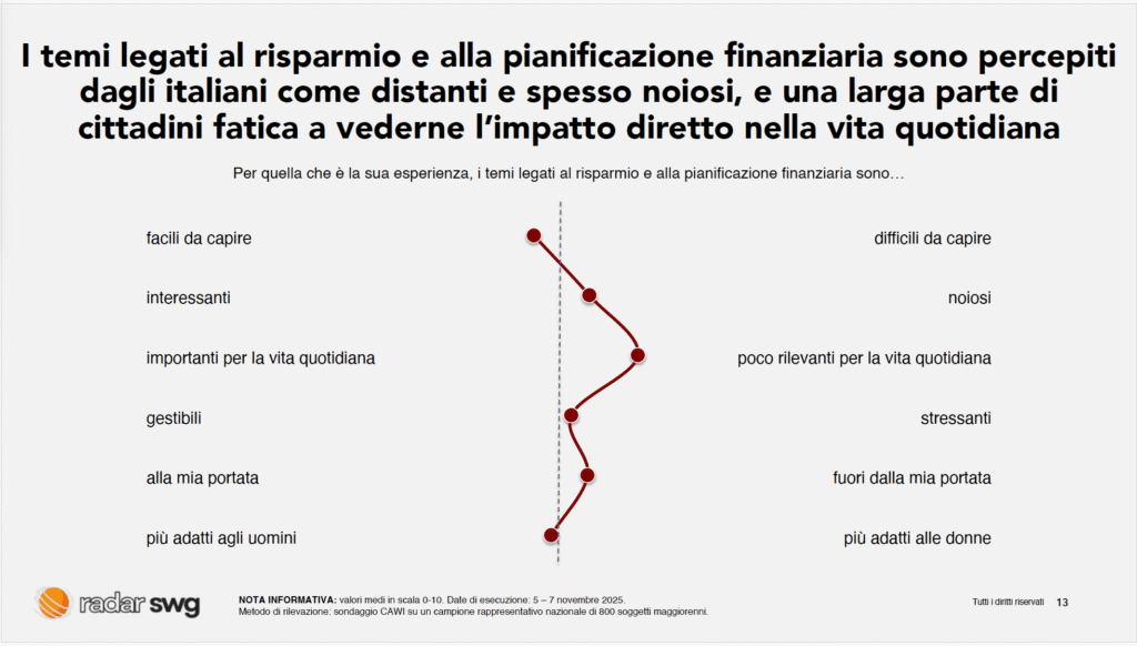 Gli italiani trovano noioso, stressante e perfino poco utile parlare di gestione del denaro e del risparmio. E pensano che sia meglio delegare il tema alla scuola. È quanto emerge dalla ricerca Radar Swg, condotta all’inizio di novembre 2025. Che non è una data casuale.